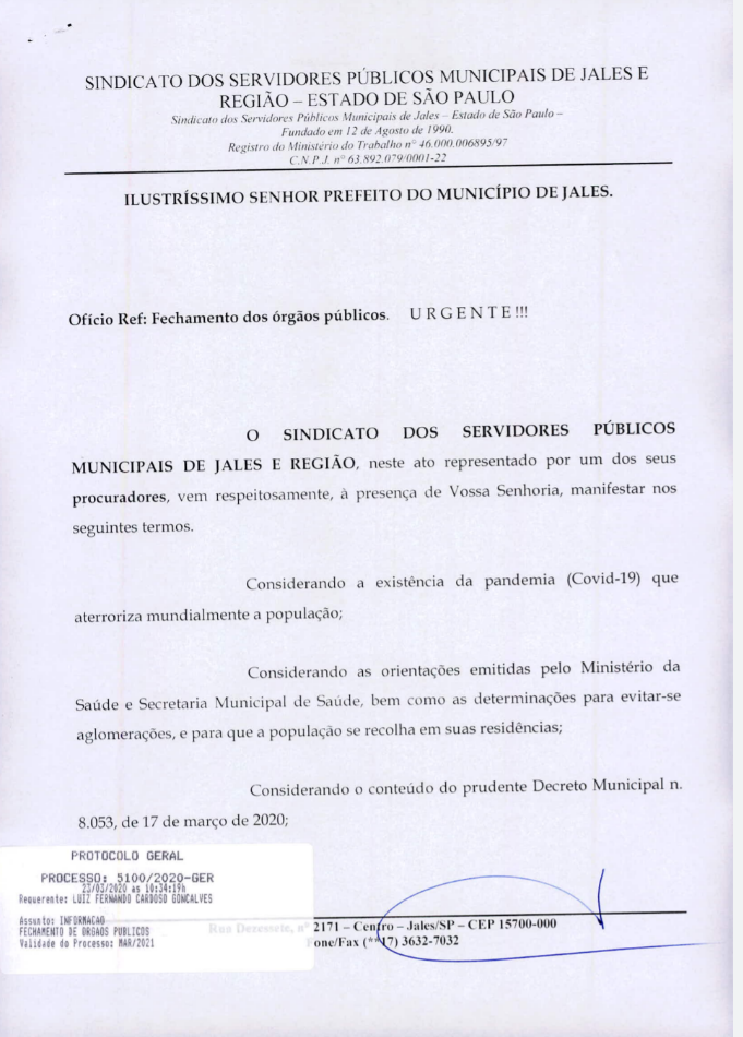 Vale lembrar que a suspensão do atendimento nas repartições públicas foi uma reivindicação do Sindicato dos Servidores Públicos Municipais de Jales e região, que, horas antes, protocolou pedido nesse sentido.
